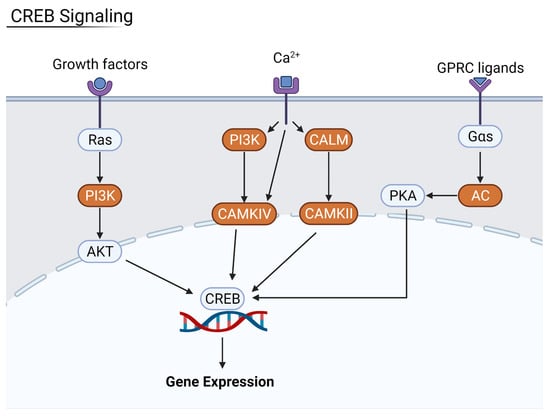 Summary of the CREB signaling pathway. Key kinases such as PI3K were upregulated in more severe patients, leading to an increase in CREB-directed gene expression. Generated in Biorender.