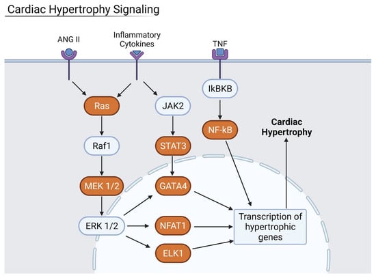 Cardiac Hypertrophy pathway where orange proteins are upregulated. ANGII, inflammatory cytokines, and TNF—all increased during COVID-19 infection—upregulated the cardiac hypertrophy signaling pathway. Generated in Biorender.