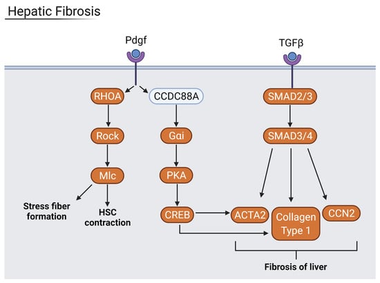 Hepatic Fibrosis pathway where orange proteins are upregulated. COVID-19 infection stimulates the fibrotic pathway via the upregulated genes. Generated in Biorender.