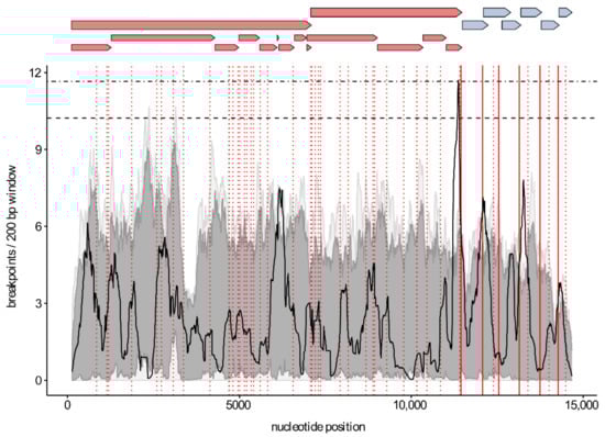 Distribution of recombination breakpoints within the WGS dataset. A 200 bp window was moved along the alignment 1 bp at a time, and the number of breakpoints detected within the window region was counted and plotted (solid lines). The horizontal upper and lower dashed lines indicate the 99% and 95% confidence thresholds for globally significant breakpoint clusters. Light and dark grey areas indicate the 99% and 95% local breakpoint clustering thresholds. The positions of body TRS- and TRS-like elements are depicted as vertical lines. The red solid lines represent the body TRS elements in the alignment. The positions of TRS-like elements that are present in at least 33% of the sequences are shown as red dotted lines. The genome organization is represented on top of the graph. Non-structural and structural proteins are shown in red and blue, respectively.