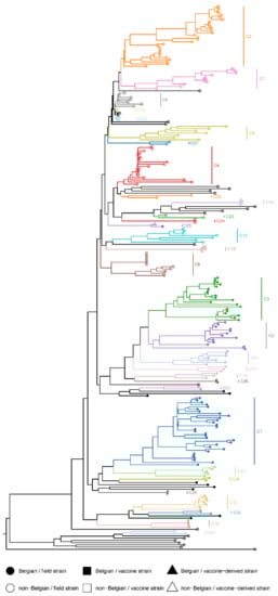Phylogenetic analysis of the concatenated dataset (CDS) revealed that the non-vaccine-like Belgian strains clustered into three phylogenetic distinct clades that could be further divided into 14 subclades (Table S3). These results suggest that multiple PRRSV-1 incursions occurred in Belgium at some point in time. Previous studies already indicated that more than one PRRSV-1 strain circulated in Europe in the 1990s [57,58,59]. The strict separation between Belgian and non-Belgian clusters should be interpreted with caution due to the limited number of PRRSV genomes that are currently available. BLAST analysis of the separate ORFs revealed strong similarities between Belgian and Dutch PRRSV strains (sequencing reports available upon request). Unfortunately, the sequence data of these Dutch strains was limited to the ORF2a–ORF7 region of the genome [60]. Additional WGS data are needed to better understand the evolution and geographical diversity of European PRRSV strains. Besides these non-vaccine-like strains, we also found a small number of vaccine-like strains (both PRRSV-1 and PRRSV-2). As all samples were collected from piglets, these strains are most likely derived directly from the vaccines that were used. Unfortunately, no information was available regarding the vaccination schedules of the animals. Circulation of PRRSV vaccine strains has been described previously [61,62,63]. Moreover, in a recent study, Eclercy et al. showed that vaccinated pigs not only develop viremia for 3–4 weeks but can also transmit the vaccine strain to naïve animals [64].