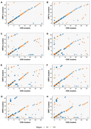Comparison of the renumbered clustering schemes of the CDS and ORF datasets. Maximum likelihood trees were generated for the CDS and ORF datasets using IQ-TREE v 2.1.0 [36]. The resulting trees were subjected to cluster analysis according to the methodology described by Prosperi et al. [40]. Clustering schemes of the ORF datasets were compared with the CDS clustering scheme, which served as reference. The renumbered CDS and ORF clusters of all PRRSV-1 strains were plotted against each other using the R package ggplot2 [46]. (A) Comparison between the ORF1a and CDS clustering schemes; (B) Comparison between the ORF1b and CDS clustering schemes; (C) Comparison between the ORF2a and CDS clustering schemes; (D) Comparison between the ORF3 and CDS clustering schemes; (E) Comparison between the ORF4 and CDS clustering schemes; (F) Comparison between the ORF5 and CDS clustering schemes; (G) Comparison between the ORF6 and CDS clustering schemes; (H) Comparison between the ORF7 and CDS clustering schemes.