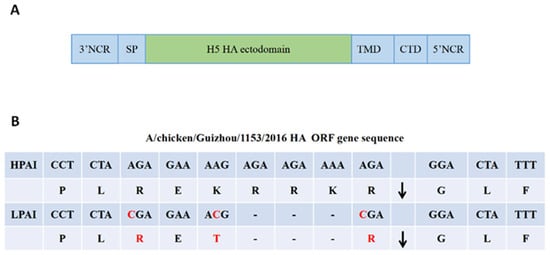 Chimeric HA design and construction. (A) The H5 HA ectodomain was sourced from the A/chicken/Guizhou/1153/2016 (H5N1) strain and the packaging signals, transmembrane domains, and the cytoplasmic domains were sourced from the influenza B virus. (B) The polybasic cleavage site in H5 HA was modified from HPAI to LPAI. 3’NCR: 3’ non-coding region; SP: signal peptide; TMD: transmembrane domain; CTD: cytoplasmic domain; 5’NCR: 5’ non-coding region.