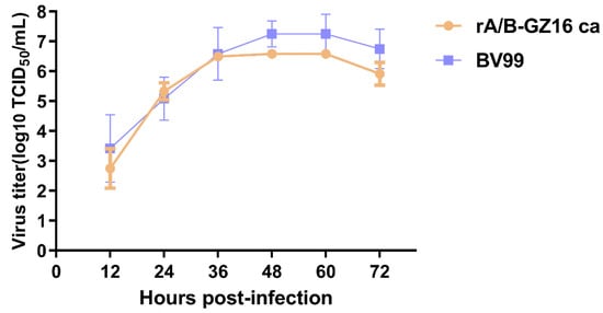 We also evaluated the growth of the H5 virus vaccine and the master donor of the influenza B virus. The rA/B-GZ16-ca virus was also titrated with MDCK cells. The virus reached a high titer at 48 h post-infection (Figure 2).