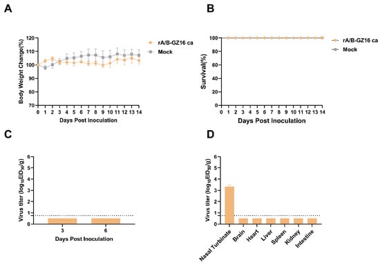 We evaluated the temperature sensitivity and cold-adapted phenotypes as well as the growth of the virus in 8–10-day-old embryonated chicken eggs. The master donor of influenza B virus had a titer of 7.7 ± 0.5 log10 EID50/mL at 33 °C and a titer of 6.2 ± 0.2 log10 EID50/mL at 27 °C (Table 1). The results revealed that the MDV of the influenza B virus was temperature-sensitive and cold-adapted. Moreover, the rA/B-GZ16-ca virus had a titer of 8.2 ± 0.2 log10 EID50/mL at 33 °C and reached a titer of 6.9 ± 0.7 log10 EID50/mL at 27 °C (Table 1). The virus could not grow in 8–10-day-old embryonated chicken eggs at 39 °C. The virus titer at 27 °C was no more than 1000 times that of the titer at 33 °C. The virus titer at 33 °C was greater than 1000 times the titer at 39 °C. Thus, the results indicate that the chimeric virus was temperature-sensitive and cold-adapted.