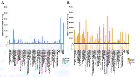 IgG antibody reactivity against H5 proteins in the serum as measured by the mean fluorescence intensity. (A) Protein microarrays, n = 5, measured the one-dose group mice serum. (B) The two-dose group mice serum was measured by protein microarrays, n = 5. The numbers listed belong to the serum. The mean fluorescence intensity (MFI) of each HA protein was determined based on the average of the median fluorescence signal of 4 replicated spots. The MFI of each HA protein was deducted from the background fluorescence signals. The higher the mean fluorescence intensity, the more antibodies bound to an HA antigen. The figures show the responses against every single HA protein antigen by the MFI on the y-axis. A/chicken/Guizhou/1153/2016 (H5N1) virus HA protein is presented in purple colour. NC: negative control; PC2: human IgG; PC3: mouse IgG; Marker: SA-Cy5.
