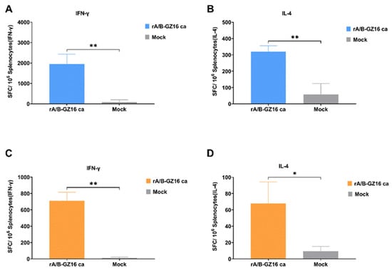 ELISpot results for splenocytes of the immunized mice. Splenocytes were collected at 3 weeks after immunization with one dose or two doses. The splenocytes were cultured and stimulated with purified HA protein from the A/chicken/Guizhou/1153/2016 (H5N1) virus, n = 3. (A) IFN-γ and (B) IL-4 results of the one-dose group. (C) IFN-γ and (D) IL-4 results of the two-dose group. Data are shown as the mean ± SD of the numbers of spot-forming cells (SFCs) per million splenocytes in each group. All the data were analyzed by an unpaired t-test. * p < 0.05, and ** p < 0.01.