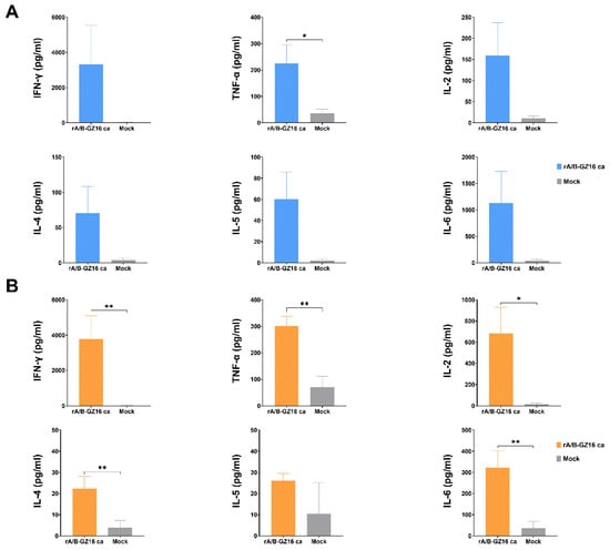 Concentrations of cytokines secreted by cultured splenocytes from immunized mice. The isolated splenocytes were stimulated with purified HA protein from the A/chicken/Guizhou/1153/ 2016 (H5N1) virus. The concentration of HA protein in each culture well was set to 10 μg/mL. The culture supernatants were collected 3 days later and subjected to the Luminex assay to measure the concentrations of multiple cytokines. (A) One-dose group. (B) Two-dose group. Data are shown as the mean ± SD. All data were analyzed by and unpaired t-test. * p < 0.05, and ** p < 0.01.