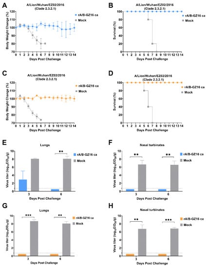 Vaccination with the H5 chimeric influenza vaccine protects BALB/c mice from lethal challenge with 10 MLD50 EZ02 at 50 μL. Body weight changes and survival were recorded for 14 days post-inoculation, n = 5. (A,B) One dose, (C,D) two doses. Virus replication in the lungs and nasal turbinates was measured on day 3 and day 6, n = 3. (E,F) One dose, (G,H) two doses. Viral titer is expressed as log10 EID50/g. The detection limit was set to 0.75 log10 EID50/g. Data are shown as the mean ± SD and were analyzed by an unpaired t-test or Mann-Whitney test. ** p < 0.01, and *** p < 0.001.