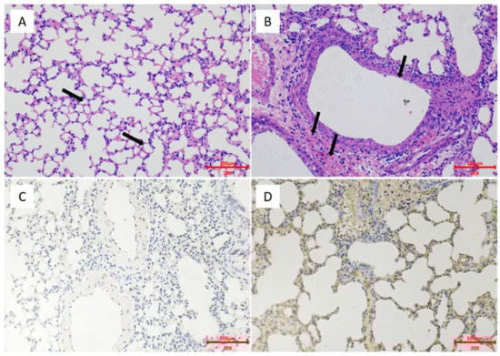 Lung HE and IHC of the two-dose group and the control group mice. The mice were euthanized on day 3 after the challenge. Images were captured at a 20× magnification. (A) Two-dose group mice, HE. (B) Control group mice, HE. (C) Two-dose group, IHC. (D) Control group, IHC.