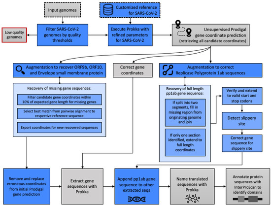 Specific refinements to our previously described genome annotation pipeline [22] were made to process SARS-CoV-2 genomes and yield gene, protein, and domain sequences. Key augmentations of Prokka v1.14.5 [8] were made for (1) improved unsupervised annotation of SARS-CoV-2 genomes and (2) the addition of custom-built supervised algorithms to improve the identification of specific proteins that were unable to be detected using the base implementation. The novel steps added by this work are indicated in blue in Figure 1 and a Docker container with these augmentations has been created for use at https://github.com/IBM/omxware-getting-started/tree/master/SARS-CoV-2_parser, accessed on 23 March 2021. The customizations for the gene and protein annotations are described briefly below and in further detail in Appendix A.1 and Appendix A.2.