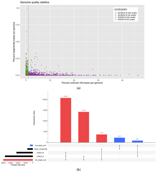 SARS-CoV-2 genome quality observations and their effect on annotation results. (a) The percent of unknown (N) and degenerate bases (as defined by IUPAC) are calculated as a function of total genome size for SARS-COV-2 genomes from two sources: NCBI GenBank and GISAID. The quality threshold of unknown bases is indicated with a dashed line. (b) Full length (red) or truncated (blue) protein products are indicated for genomes by quality criteria status: our selected criteria (Criteria A), more stringent criteria (Criteria B), or below quality thresholds. In this upset plot for each vertical bar, the categories defining the intersection are indicated with filled-in dots. For example, the first bar represents the number of proteins that pass both Criteria A and B and are also full length proteins, whereas the second bar represents the number of full length proteins that pass Criteria A but not Criteria B and are still full length. For criteria definitions, see Section 2.1.