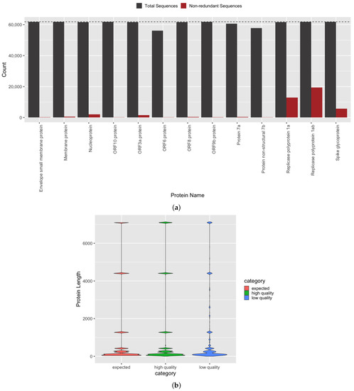 Furthermore, not only must the complete set of named genes and proteins be identified for accurate genome annotation, but the generated sequences must also be grounded in biological reality. Specifically, in silico predicted sequences should not be truncated with respect to the length of known references, and the mutational density must be low, considering the temporally recent emergence of SARS-CoV-2 and observed lower mutation rate, compared to other RNA viruses [18]. Using our semi-supervised gene and protein annotation method (Figure 1 and Section 2.2), we were able to identify full length protein products that, on a per protein basis, match the expected lengths of known reference sequences with an average observed/expected protein length value of 99.1% (Figure 3b). The distributions of our predicted and the expected protein sequence lengths are observed to be statistically similar by two-sample Kolmogorov–Smirnov test (D = 0.0071, p < 2.2 × 10−16) and are 8.75-fold more similar (D = 0.0617) than those predicted from genomes not passing our quality thresholds, i.e., low quality genomes.