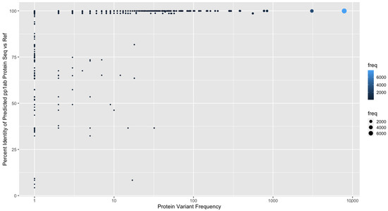 For Replicase polyprotein 1ab, the protein sequence variant frequency and protein sequence similarity of our predicted sequence to the known UniProt ID: P0DTD1 references is shown. The frequency of each protein variant is indicated by color and point size.