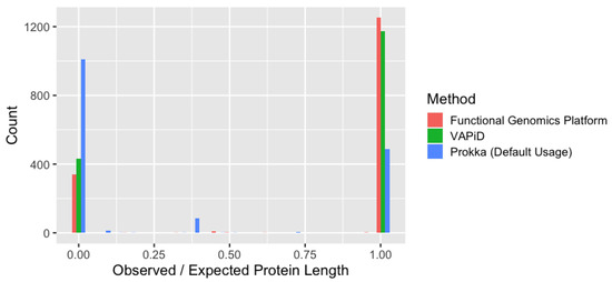 Protein length comparisons against known reference sequences for three pipelines: Functional Genomics Platform (our method), VAPiD, Prokka with default usage for viral genomes. The count of protein sequences at each observed/expected value is plotted for each pipeline. Length is set to zero if a protein is missing in the results from that pipeline but present in another.