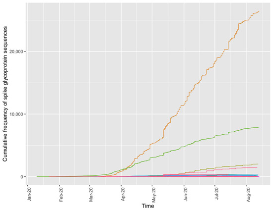 Since the S protein is key in the recognition of the host cellular receptor to initiate virus entry and host cell invasion and the target of multiple vaccines, antivirals, and diagnostics, we further examined its observed variants. By querying the S protein from the Functional Genomics Platform and accessing 4548 unique sequences, including metadata, such as collection date and exposure region, we observed two predominant S protein variants that shift in their cumulative frequency over time (Figure 6). Initially, an exact match to the reference spike glycoprotein sequence (green line, UniProt: P0DTC2) is observed most frequently. Then in mid-April 2020, the notable variant D614G (orange line) with now known increased infectivity, due to interaction with the ACE2 receptor [32,33], overtakes the ancestral reference sequence (green line) in its abundance, achieving fixation. Two other differing sequences are observed at lower abundance in this genome cohort and correspond to P1140X (olive line) and S2 cleavage product (pink line). Additionally, there are minor variants observed in fewer than 1% of the sequenced genomes. For example, we observed five protein sequences to contain the N501Y mutation from 13 genomes originating from Oceania (submitted 2 July 2020) and North America (submitted 1 June 2020). These variants are also observed to contain the D614G mutation, but are not present with the 69–70 deletion present in the B.1.1.7 variant of concern (U.K.) or B.1.351 E484K mutation (South Africa). Our observations are consistent with the current understanding of multiple introduction events causing the emergence of the N501Y variants [34]. Furthermore, since this mutation is observed in the B.1 and B.1.1 lineages which predate the current B.1.1.7 and B.1.351 variants, it further clarifies the current timing of mutational introduction points in the pandemic. Some of our observed sequence variants may be due to sampling limitations or data artifacts, e.g., sequencing or genome assembly error, but if a minor variant confers a selective advantage, its frequency could shift to become a more common variant as we have seen in recent months with the B.1.1.7 (Alpha), B.1.351 (Beta), and B.1.617.2 (Delta) variants [35]. The detection of these type of mutations is crucial to understanding viral evolution and sequence divergence. The identification of these mutations provides a jumping off point for further explorations in biochemical and structural experiments, which are part of common virological workstreams.