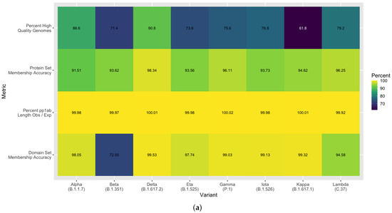 Beyond the initial corpus used to develop this method, we aimed to assess the robustness of the method against the more recent variants that have emerged. A random sampling of SARS-CoV-2 genomes were retrieved from NCBI GenBank [20] across the eight named variants of interest and variants of concern by US CDC and WHO as of 19 August 2021. The resulting annotations were then evaluated for comprehensiveness and accuracy. In accordance with our previously described quality control steps, the variant-diverse genomes (500 randomly sampled genomes per variant) were assessed for quality, and 3079 high quality genomes out of 4000 total were observed. On average, 77.0% ± 9.0 s.d. passed the quality thresholds, with Beta and Kappa having the most low quality genomes (Figure 8a). Using this set of high quality variant-diverse genomes, we achieved 91.5–98.3% protein set membership accuracy across all variants, with the highest detection accuracy in the Delta variant (Figure 8a). Additionally, we were able to identify full length pp1ab sequences in over 99% of all genomes across all variants. Our spike protein domain annotations were observed to have an average 95.0% set membership accuracy. Beyond this, we assessed the ability of our annotation method to be able to identify key mutations in the spike glycoprotein. For this, we retrieved the set of mutations expected in at least 95% of sequences for each variant [25]. With overwhelming accuracy, we were able to identify all mutations of concern or interest across all variants and all other expected mutations for any of the variants with an average 99.8% accuracy (Figure 8b). This includes observations of deletions early in the S protein and differentiation between substitutions P681H, which is a mutation of interest, and P681R. This finding demonstrates the ability of our pipeline to scale with additional SARS-CoV-2 genomes across variants under the constraints of evolving sequence divergence. The high accuracy achieved in multiple attributes of our predicted protein and domain sequences demonstrates the robustness of this method as well as its scalability and extensibility for surveillance in the face of expanding viral evolution.