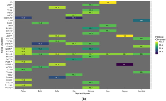 - Latif, A.A.; Mullen, J.L.; Alkuzweny, M.; Tsueng, G.; Cano, M.; Haag, E.; Zhou, J.; Zeller, M.; Hufbauer, E.; Matteson, N.; et al. Lineage Comparison. Available online: https://outbreak.info/compare-lineages?pango=Alpha&pango=Beta&pango=Delta&pango=Eta&pango=Gamma&pango=Iota&pango=Kappa&pango=Lambda&gene=S&threshold=95&dark=true.