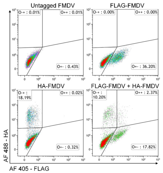 To confirm and quantify the level of virus co-infection, cells infected with either one or both epitope-tagged viruses were analysed by flow cytometry. Analysis of cell populations infected with a single epitope-tagged virus at an MOI of 1 showed that 36.2% of the population was infected with FLAG-FMDV, and 18.19% of the population was infected with HA-FMDV (Figure 2). In populations of cells co-infected with both FLAG-FMDV and HA-FMDV at an MOI of 0.5 per virus, 10.2% of the population was infected only with FLAG-FMDV, 17.82% was infected only with HA-FMDV and 2.37% was co-infected FLAG-FMDV and HA-FMDV (Figure 2). Co-infected cells were detected in two further separate experiments, although variation in the percentage of cells infected with each virus was observed (Supplementary Table S1).