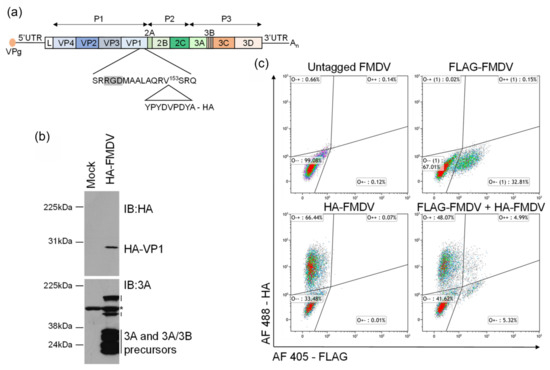 The following are available online at https://www.mdpi.com/article/10.3390/v13122433/s1, Figure S1: Immunofluorescence microscopy of confluent monolayers of ZZ-R 127 cells infected with FLAG-FMDV O1K/O UKG35 and HA-FMDV O1K/O UKG35 (MOI = 0.5/virus) for 6 h. Figure S2: Growth comparison of HA-tagged and non-tagged Asia1/O1K FMDV. Table S1: Co-infection of goat epithelium cells with HA- and FLAG-tagged FMDV O1K/O UKG35.