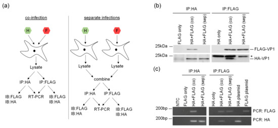 These experiments showed that HA-tagged VP1 was successfully immunoprecipitated from both co-infections and from combined lysates from separate infections using anti-HA-agarose beads (Figure 4b, left hand side). Interestingly, FLAG-VP1 was present in HA-immunoprecipitates from co-infected cells, but not in HA-immunoprecipitates from separate, combined lysates or when no HA-tagged virus was present. In the reciprocal experiment, FLAG-tagged VP1 was immunoprecipitated from both co-infections and separate, combined infections using anti-FLAG-agarose beads (Figure 4b, right hand side), and this was accompanied by HA-tagged VP1 in the FLAG-immunoprecipitates from co-infected cells, but not from combined lysates from separate infections or when no FLAG-tagged virus was present (note that the HA-tagged VP1 can be observed below the antibody light chain labelled * in the right hand panel of Figure 4b). These experiments provide evidence that supports the hypothesis that capsid proteins encoded by different incoming viral genomes may be incorporated into a single chimeric progeny virus particle during co-infection.