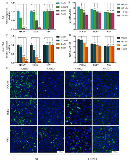 NaIO4 inhibits PDCoV infection at ST and LLC-PK1 cell. ST/LLC-PK1 cells were pretreated with NaIO4 for 30 min and infected with PDCoV, TGEV, and VSV. Samples were collected at 24 hpi and assayed by RT-qPCR (A,C), TCID50 (B,D), or cells were fixed and tested by immunofluorescence assay (E) at 8 hpi. Experiments were performed at least three times. Differences were considered significant at * p < 0.05, ** p < 0.01, *** p < 0.001; ns: differences were not significant; one-way ANOVA.