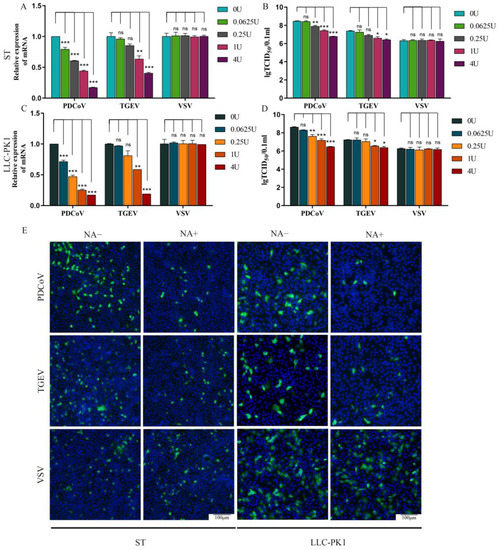 NA inhibits PDCoV infection at ST and LLC-PK1 cell. ST/LLC-PK1 cells were pretreated with NA for 2 h and infected with PDCoV, TGEV, and VSV. Samples were collected at 24 hpi and assayed by RT-qPCR (A,C), TCID50 (B,D), or cells were fixed and tested by immunofluorescence assay (E) at 8 hpi. Experiments were performed at least three times. Differences were considered significant at * p < 0.05, ** p < 0.01, *** p < 0.001; ns: differences were not significant; one-way ANOVA.
