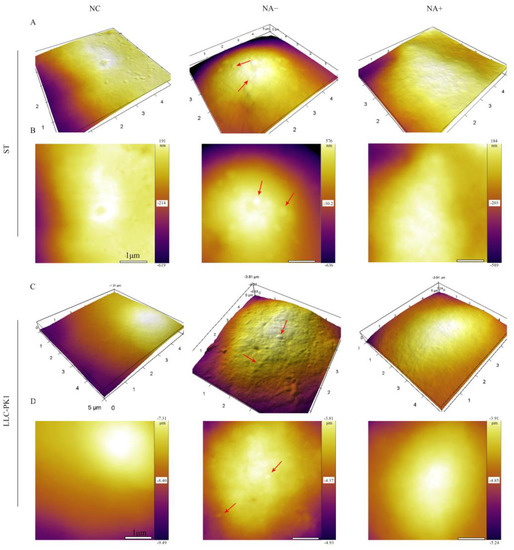 Detection of PDCoV adhesion to ST and LLC-PK1 cells by AFM.ST/LLC-PK1 cells were pretreated with NA for 2 h and incubated with PDCoV at 4 °C to promote virus attachment. AFM deflection images (B,D) and 3D AFM images (A,C) of PDCoV adsorbed on the cell surface. Those figures show high-resolution images recorded in the square regions. PDCoV adsorbed on the cell surface is indicated by a red arrow.