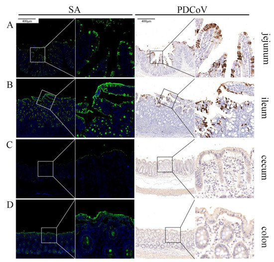 To clarify whether PDCoV could recognize SA in vivo, the intestinal tissues from different parts (jejunum, ileum, cecum, and colon) of PDCoV-infected piglets were labeled using PDCoV N monoclonal antibody and SA using FITC-WGA, respectively. Clinically, PDCoV also mainly infects the small intestine of piglets, which is consistent with our previous results [19,21]. The distribution of PDCoV and SA were closely correlated, and SA was abundant on the surface of the small intestinal tissues (jejunum and ileum) (Figure 5A,B), where PDCoV was also present in large amounts. On the surface of the large intestinal tissues (cecum and colon) (Figure 5C,D), SA was less abundant and PDCoV was less capable of infection.