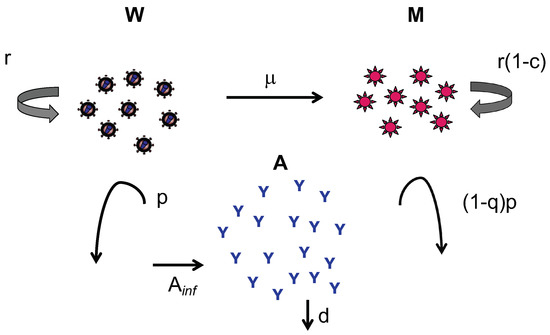 Schematic diagram of the model. The wild-type population (W) increases at rate r, mutates to the mutant strain at rate and is cleared by antibodies at rate p. The mutant population increases at rate , where c is the fitness cost of the mutation; increases by mutation from the wild-type strain at rate ; and is cleared by antibodies at rate , where represents reduction in antibody blocking against the mutant. The antibody population increases at the time of each plasma infusion (by fixed amount ) and decays exponentially at rate d.