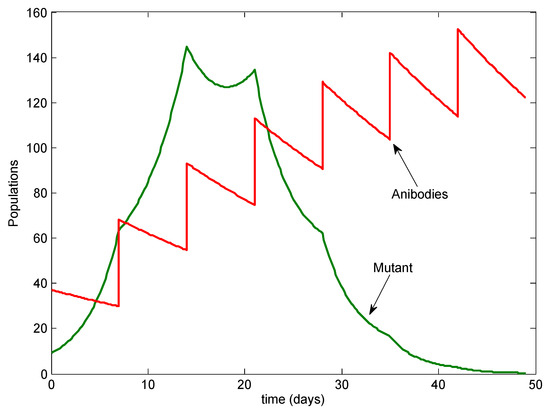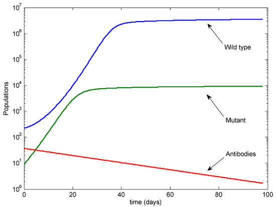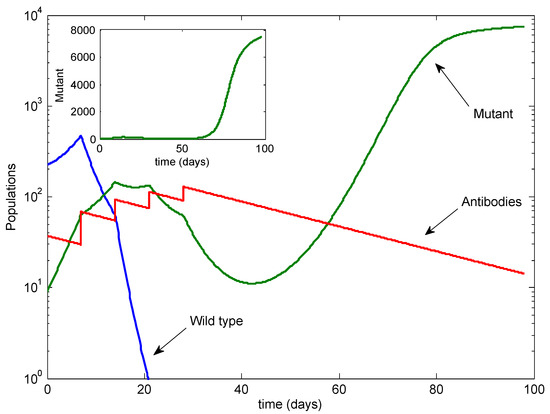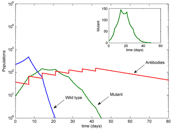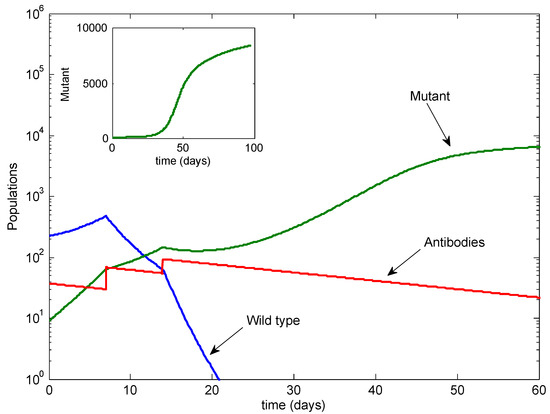 Figure 3 illustrates the standard case of three antibody infusions, given at Day , Day 7 and Day 14, as per the protocol followed in Taylor et al. [11,12]. In this case, the wild-type strain is eradicated, while the mutant dominates. Note that the eventual mutant level is similar to the mutant level in Figure 2.