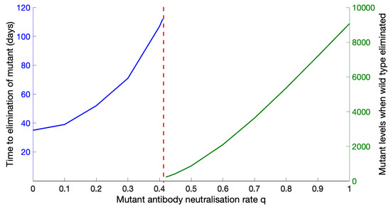Sensitivity of the outcome to the mutant antibody-neutralisation rate, q. Below , elimination of the mutant is possible; above , elimination is no longer possible, and the mutant levels increase as q increases.
