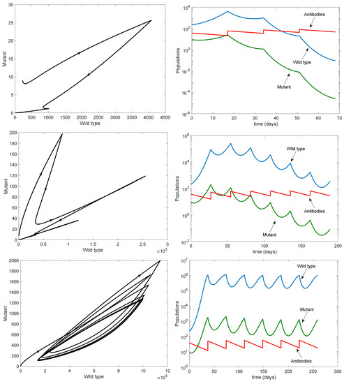 Finally, we illustrated the effect of changing the period on the persistence of both strains. The top row of Figure 8 shows that both strains can be eradicated when the period is small, with eradication occurring quickly for both strains. The middle row shows that the time to eradication increases as the period increases, with potentially large transient values of the wild-type virus occurring before eradication is achieved. The bottom row shows both strains persisting in the form of a periodic orbit; in this case, the disease cannot be eradicated with finitely many antibody infusions.
