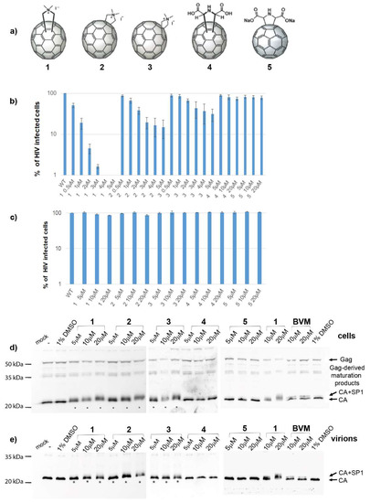 Fullerenes 1–5 (Figure 1a) were first tested for their cytotoxicity. None of the tested compounds revealed any cytotoxic effect in the tested concentration range (1–50 µM) on HEK 293 cells (data not shown). Next, we tested their impacts on HIV-1 via single-round infectivity assay using VSV-G-pseudotyped HIV-1 particles. The virus was produced upon transfection of HEK 293 cells with appropriate vectors in the presence of the fullerene derivatives, and the released HIV-1 particles were used for infection of fresh cells. We observed significant blocking of HIV-1 infectivity as follows: 1 (EC50 1.5 µM), 2 (EC50 1.8 µM), and 3 (EC50 2.7 µM) (Figure 1b). Compounds 4 and 5 showed substantially lower inhibition of HIV-1 infectivity, with EC50 values of 37 and 27 µM, respectively. In agreement with published data [35,36], we did not observe any effect of these fullerenes on the early phase of HIV-1 infection—i.e., when these compounds were added to the HEK 293 cells infected with normalized amounts of reporter HIV-1 (Figure 1c).