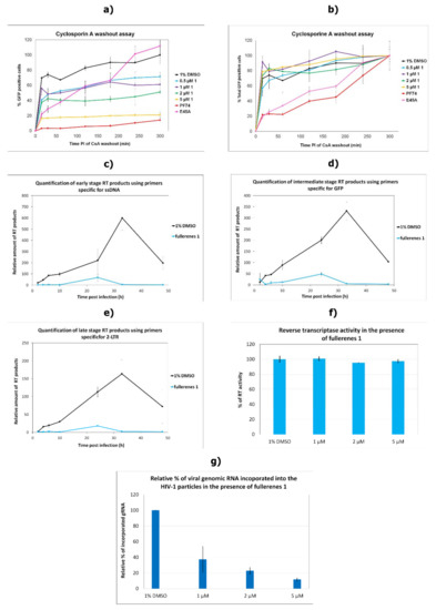 The effects of fullerene 1 on the selected steps of early phase of HIV-1 replication cycle—HIV-1 uncoating. (a,b) CsA washout assay. OMK cells were infected by normalized amounts of VSV-G pseudotyped HIV-1 produced in the presence of indicated concentration of fullerene 1, or 5 µM PF74 was added. At the indicated times post-infection, the CsA-containing medium was replaced with fresh, CsA-free culture medium. The percentage of GFP-positive OMK cells was determined by flow cytometry and (a) normalized to the number of DMSO-containing non-drug control cells, which was considered 100%, or (b) normalized by setting the number of GFP-positive cells to 100% for HIV-1 reverse transcription. Progress of reverse transcription, (c) early stage, (d) intermediate stage, and (e) late stage. VSV-G pseudotyped HIV-1 particles produced in the absence or presence of 5 µM fullerene 1 were used to infect fresh HEK 293 cells, which were harvested 2, 4, 6, 10, 24, 33, and 48 h post-infection. Real time PCR analysis of isolated DNA was used to detect different reverse transcription products. The results were normalized for CA content using semi-quantitative Western blotting and two housekeeping genes: phospholipase A and C-C chemokine receptor type 5—CCR5. (f) Activity of reverse transcriptase was measured using a reverse transcriptase assay, colorimetric. Released virions produced in HEK 293 cells in the presence of indicated concentrations of fullerene 1 were harvested and centrifuged 48 h post-transfection. The subsequent steps were performed according to the manufacturer’s protocol (Merck). (g) Amount of viral gRNA incorporated into HIV-1 particles. The amount of gRNA from HIV-1 particles released from HEK 293 cells treated by DMSO or the indicated amount of 1 was quantified by real-time PCR analysis. If not stated otherwise, results represent two independent experiments.