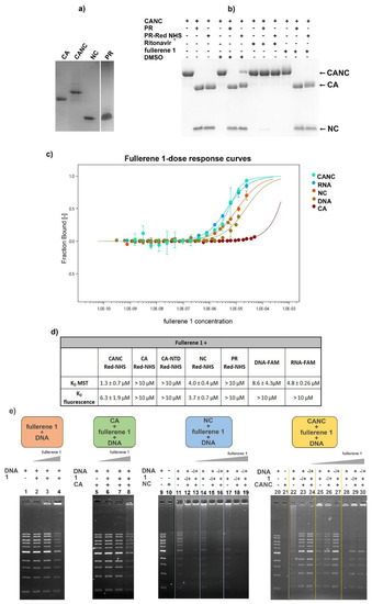 For the MST, the analyzed HIV-1 proteins—CA, NC, CANC, and PR (Figure 5a)—were prepared and fluorescently labelled using Protein Labeling Kit Red-NHS (Nanotemper Technologies). The proper dimer formation of fluorescently labeled HIV-1 PR was confirmed by its proteolytic activity on CA-NC (Figure 5b). FAM-labeled RNA and DNA oligonucleotides were purchased from Merck Life Sciences. During the MST measurements, we kept all labeled samples at constant concentrations, and the final concentration of 1 ranged from 15 nM to 50 µM (Figure 5c). The determined KD values of fullerene 1 to selected HIV-1 proteins are summarized in Figure 5d. The strongest interaction, corresponding to KD 1.3 µM, was observed for 1 and non-assembled HIV-1 CANC. Lower binding affinity (KD 4 µM), though still comparable with that of 1 to CANC, was determined for mature HIV-1 NC. Fullerene 1 revealed also binding affinity for both RNA and DNA oligonucleotides. RNA oligonucleotides showed slightly higher affinity towards the fullerene; however, the KD was about three times a higher compared to that of 1 and CANC (4.8 µM for RNA, 8.6 µM for DNA). KD values for full-length CA or its N-terminal domain, and for PR, were at least one-order of magnitude higher compared to those for CA-NC and NC. However, due to the low solubility of 1, we were not able to determine exact KDs at higher concentrations.