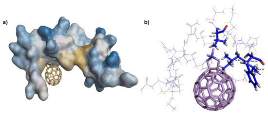 Docking of fullerene 1 into HIV-1 NC. Docking into NC (PDB 1F6U) was carried out in two programs, PLANTS and AutoDock Vina: (a) Heat map of NC with docked fullerene 1 (blue: hydrophilic, gold: hydrophobic). (b) A detailed illustration of fullerene 1 and the NC hydrophobic plateau formed by Val13, Phe16, Ile24, and Ala25 of the NC proximal ZF (the hydrophobic residues are drawn in capped sticks and marked by labels).