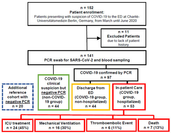 We performed a non-interventional, observational study at the university hospital Charité—Universitätsmedizin Berlin. The study was approved by the ethics committee at Charité—Universitätsmedizin Berlin, Campus Virchow-Klinikum, Germany (no. EA2/095/20). All experiments were performed in accordance with relevant guidelines and regulations. From 19 March, 2020 to 18 June, 2020, we enrolled a consecutive sample of 141 patients presenting to the emergency department with clinically suspected COVID-19. Patients were tested by SARS-CoV-2 polymerase chain reaction (PCR) in pharyngeal swabs. The PCR results, which were received within 48 h, did not affect treatment at presentation. Amongst the 141 patients, 97 were diagnosed with COVID-19 of which 53 were hospitalized and 44 were discharged to home care. A total of 44 patients were tested negative for SARS-CoV-2. Additionally, 20 patients with negative SARS-CoV-2 PCR swabs and no clinical suspicion of COVID-19 (tested as general care within their admission to the emergency department, due to, e.g., minor traumata) were considered a reference cohort.