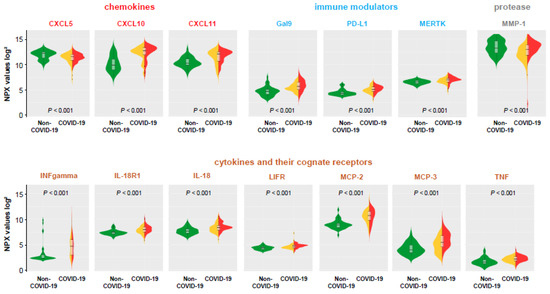 Proteome analyses—PEA values of discriminatory analytes with significant differences (p < 0.001) between non-COVID-19 and COVID-19 patients. Data are visualized by violin plots, which are a combination of kernel density plots, and box plots depicting median, 25th, and 75th percentiles. A high-normalized protein expression (NPX) value resembles a high protein concentration and expresses the relative quantification between samples. NPX values are given on a log-scale. Green = non-COVID-19; yellow = COVID-19 without hospitalization; red = COVID-19 with hospitalization; black dots: outliers.
