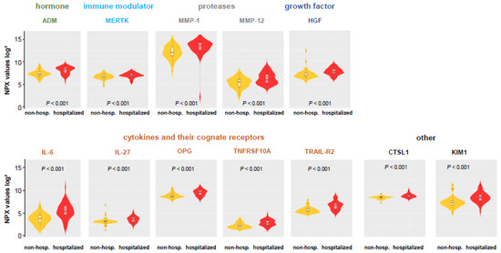 Next, we focused on protein levels with regard to differences between COVID-19 patients that were discharged from the ED based on clinical evaluation (non-hospitalized COVID-19 group) or were subsequently hospitalized (hospitalized COVID-19 group). We identified a subset of protein analytes that were significantly (p < 0.001) elevated in hospitalized COVID-19 patients (ADM, CTSL1, HGF, IL-27, IL-6, KIM1, MERTK, MMP-1, MMP-12, OPG, TNFRSF10A, and TRAIL-R2) (Figure 4) (medians, interquartile ranges, and p-values are shown in Supplemental Table S3). The shortlist proteins include known markers of cellular degradation, hormones, as well as interaction with microbes and viruses.