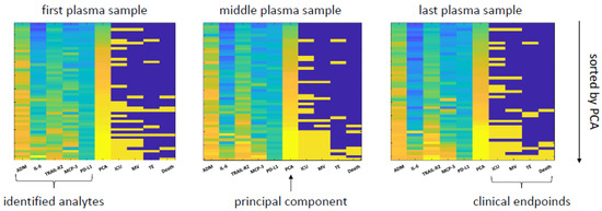 Heat map of predictive performance—the heat map presents the relative values of the five selected analytes (ADM, IL-6, MCP-3, TRAIL-R2, PD-L1) and the corresponding principal component analyses (PCA, as a combination of these markers) in relation to four clinical events (ICU treatment, TE, MV, and death). The first heat map (left) presents values based on plasma taken initially in the ED. The middle heat map presents values from the plasma sample at the middle of the hospital stay, and the last heat map plasma sample from the latest time point (either prior to discharge of the patient or before fatal outcome). The samples are sorted according to the value of PCA.