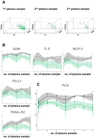 Illustration of predictive protein values and kinetics as well biological variation of proteins during hospital stay—(A) three-dimensional illustration of predictive protein values. Green dots: non-hospitalized COVID-19; red dots: hospitalized COVID-19 with ICU admission; blue dots: hospitalized COVID-19 with ICU admission and requirement for mechanical ventilation; Black dots: COVID-19 with fatal outcome. (B) Kinetics of the five selected markers separately (ADM, IL-6, MCP-3, PD-L1, TRAIL-R2) and (C) the PCA based on the combination of the analytes. The x-axis represents seven different time points of plasma procurement, with the first (1) taken at the ED and the seventh (7) isolated prior to discharge or death of the patient. Samples two to six were isolated during the hospital stay at approximately similar time intervals. Depicted are values of all n = 53 hospitalized COVID-19 patients with three time points. For n = 10 (solid dots) patients plasma samples at seven time points were analyzed. Open dots represent patients with three time points. Green dots = discharged patients, black dots = patients with fatal outcome. Shown are data for individual COVID-19 patients with survival (solid green dots = patients with seven time points, open green dots = patients with three time points) and mean values (solid green line) with standard deviation (light green area) and data for individual COVID-19 patients with fatal outcome (solid black dots = patients with seven time points, open black dots = patients with three time points) and mean values (solid black lines) with standard deviation (grey area).