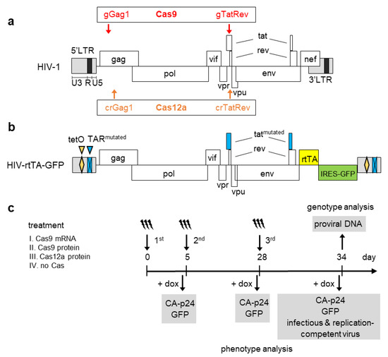 Since the discovery of HIV as the causative agent for AIDS almost 40 years ago, extensive research has resulted in antiretroviral therapy (ART) with a combination of drugs that can reduce the viral load in HIV-infected patients to undetectable levels, but unfortunately, does not permanently cure the patient. These drugs target essential processes in the viral replication cycle, such as reverse transcription of the viral RNA genome into a DNA copy and integration of this DNA in the cellular genome, but do not inactivate the proviral DNA in infected reservoir cells [1,2,3]. As the viral load rebounds when ART is halted, HIV-infected individuals need lifelong therapy with potential toxicity, and there is the continuous risk of the development of drug resistance [4,5]. Therefore, novel therapeutic strategies aiming at the permanent inactivation of the viral reservoir are explored, including targeting the integrated provirus with CRISPR-Cas gene-editing systems (reviewed in [6,7]).