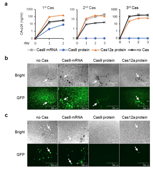 Upon the administration of dox to the control (untreated) cells, the CA-p24 level in the culture medium rapidly increased, which reflects dox-induced viral gene expression and replication (Figure 2a). When cells were treated with Cas9 protein, the CA-p24 level after the first treatment was reduced compared to the control cells, whereas no CA-p24 was detectable after the second and third treatment. In contrast, the CA-p24 level in the Cas9 mRNA treated cell cultures remained high after the 1st, 2nd and 3rd treatment, indicating that repeated Cas9 mRNA treatment did not reduce viral gene expression. Cell cultures treated once or twice with Cas12a protein also did not demonstrate a reduced CA-p24 level, whereas a slightly reduced CA-p24 production compared to the control cells was observed after the 3rd treatment. Analysis of GFP expression by fluorescence microscopy revealed a similar pattern (Figure 2b and Supplementary Materials Figure S1). High GFP production was observed in the control cells and the cells that were treated up to three times with Cas9 mRNA. GFP production of the Cas9 protein-treated cells was slightly reduced after the first treatment and greatly reduced after the second and third treatment. GFP production of the Cas12a-treated cells was similar to that of the control cells after the 1st and 2nd treatment and slightly reduced after the 3rd treatment. These CA-p24 and GFP expression analyses indicate that Cas9 protein treatment inactivated viral gene expression and replication more effectively than Cas12a protein treatment, whereas Cas9 mRNA treatment had no effect. In fact, triple Cas9 protein treatment reduced CA-p24 production below the detection level, and only a very low level of GFP fluorescence was detectable.