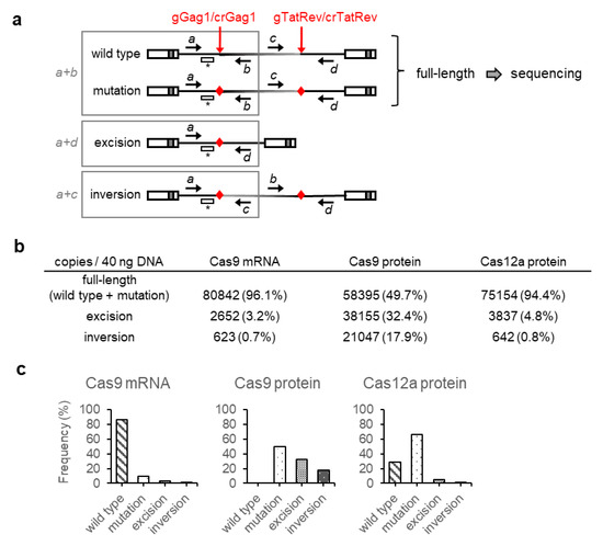 We previously demonstrated that CRISPR-Cas9 attack of proviral DNA with dual gRNAs could result in mutation of the gRNA target sites, excision of the fragment between the target sites, or inversion of this DNA fragment [16,18]. To analyze the proviral DNA modifications resulting from the different transient CRISPR-Cas treatments, intracellular DNA was isolated after the 3rd Cas treatment, and the proviral DNA was analyzed by qPCR using different primer combinations around the gGag1 and crGag1 target sites to quantify the full-length, excision and inversion products (Figure 3a). As the full-length PCR fragments can have either a wild-type or mutated target site, we sequenced these DNA products to determine the type of lesion and the mutational frequency.