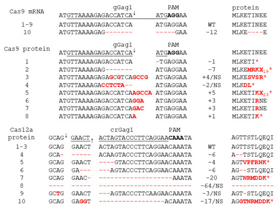 When cells were treated with Cas12a protein, most of the proviral DNA (94%) was found to be full length, and excisions (5%) and inversions (1%) were detected at much lower frequencies (Figure 3b). Sequencing of the crGag1 site in the full-length product demonstrated that 3 out of 10 sequenced fragments were wild type (Figure 4). Most of the fragments (7 out of 10) had nucleotide deletions around the Cas12a cleavage site, sometimes combined with nucleotide substitutions, but nucleotide insertions—as frequently observed upon Cas9 treatment—were not detected. This mutational pattern is consistent with the pattern previously described when targeting HIV with the CRISPR-Cas12a system in cells stably expressing Cas12a [19]. Most mutations at the crGag1 site are frameshift mutations in the Gag gene that will abolish the production of Gag/Pol proteins. The other mutations are 3 and 6 nt deletions that remove one or two amino acids in the important CA domain of Gag, which likely also inactivate or attenuate the virus. We did not sequence the crTatRev1 target site, and some of the proviruses with a wild-type crGag1 site may be mutated at the crTarRev1 site. However, it seems plausible that a fraction of the proviruses is not affected and has a wild-type sequence at both positions. Incomplete inactivation of the proviral DNA can explain the reduced level of viral gene expression and replication (Figure 3a–b), and the production of infectious virus (Figure 3c) observed upon dox administration.