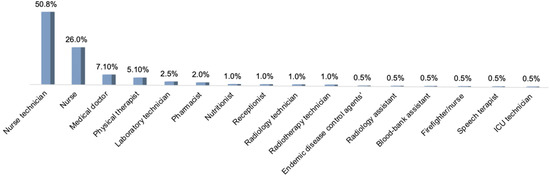 For those individuals with satisfactory results of RT-qPCR, only 804 (25.9%) had information regarding their occupational status, in which 67.3% (541/804) were healthcare professionals. Among those healthcare professionals that tested positive for SARS-CoV-2, the highest frequency was observed in nurse technicians (including fellows or interns) (50.8%; n = 100) and nurses (26.0%; n = 51). Other healthcare professionals’ categories that tested positive for SARS-CoV-2 had frequencies lower than 10% (Figure 2).