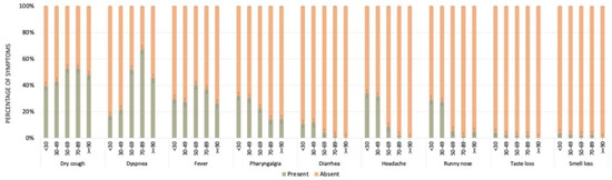 The most frequent symptoms reported by those individuals that tested positive for SARS-CoV-2 infection were fever, dyspnea, dry cough, and pharyngalgia (Figure 3). A comparative analysis between the main reported symptoms and results for SARS-CoV-2 infection is presented in Table 2. All symptoms were statistically different between individuals that tested positive and negative for SARS-CoV-2 infection. Failure to present or report all symptoms was more frequent in the negative group (p < 0.001).