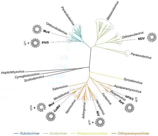 Members of the Paramyxoviridae family are enveloped viruses with non-segmented negative-strand RNA genomes. These viruses share similar gene expression and genome replication mechanisms to the members of the other ten families of the Mononegavirales order. Paramyxoviruses are currently divided into 4 subfamilies, 17 genera, and 78 species (Figure 1) [1] (information as of November 2021, for an update see https://talk.ictvonline.org/taxonomy/). Paramyxoviruses are found in a broad range of animals, including mammals, fishes, reptiles, or birds and include several human and animal pathogens such as measles virus (MeV), mumps virus (MuV), canine distemper virus (CDV), and Newcastle disease virus (NDV). Some, such as Nipah virus (NiV) and Hendra virus (HeV), regularly emerge in human or animal populations where they cause deadly epidemics. Although vaccines exist against some paramyxoviruses, effective antiviral treatments for post-exposure prophylaxis are urgently needed [2,3].