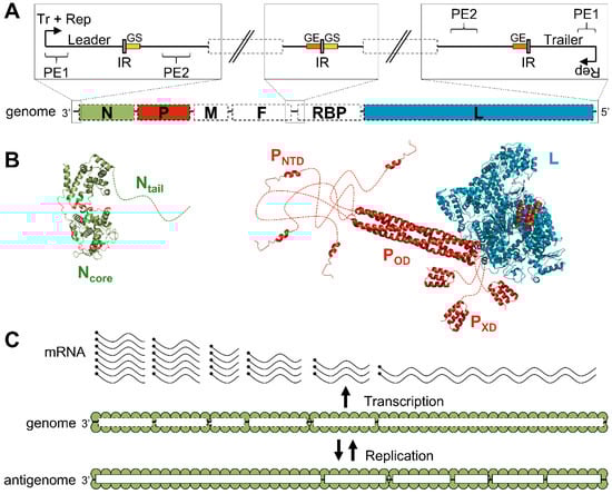 Viral transcription and replication are both mediated by an RNA synthesis machinery composed of a viral polymerase complex and its encapsidated template. The polymerase complex consists of the large protein (L) and its co-factor the phosphoprotein (P) [4,5,6,7]. This complex uses a genome (or antigenome) embedded into a homopolymer of viral nucleoproteins (N) as a template [8,9,10]. The encapsidation of the RNA in this ribonucleoprotein structure, known as the nucleocapsid, prevents the annealing of positive and negative RNA strands into double-stranded RNA structures, as well as the folding of genomic RNA into secondary RNA structures, which helps to prevent recognition by innate immune receptors [11,12]. It also protects the genome from degradation by nucleases [13,14] and from being targeted by siRNA [15,16].